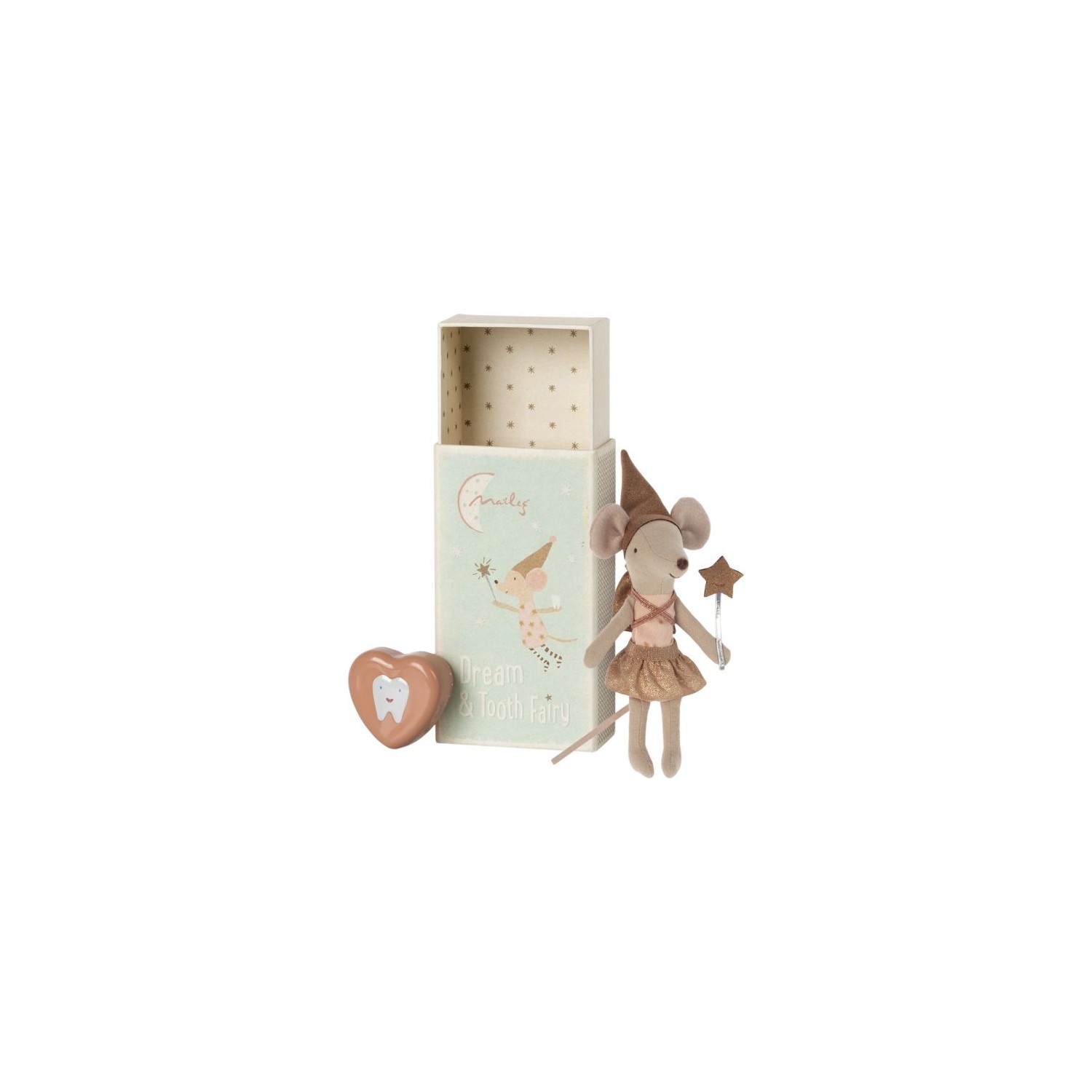 Souris fée des dents de la marque Maileg , accompagnée de sa boîte d’allumettes et d'une petite boîte pour recueillir les dents de lait de votre enfants.